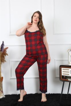 Moda Çizgi Kadın Büyük Beden Kırmızı Ekoseli İp Askılı Pijama Takım 202197