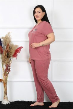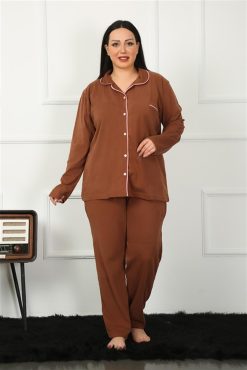 Moda Çizgi Kadın Büyük Beden Önden Düğmeli Kahve Pijama Takım 202185
