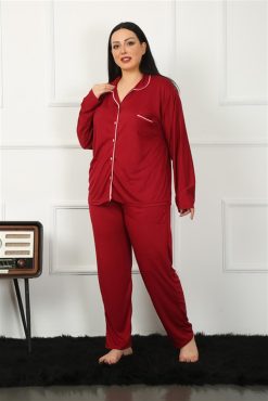 Moda Çizgi Kadın Büyük Beden Önden Düğmeli Bordo Pijama Takım 202185