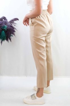 Moda Çizgi Düğme Aksesuarlı Yüksek Bel Pantolon Bej