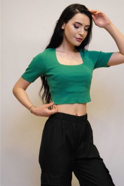 Moda Çizgi Kare Yaka Triko Crop Yeşil