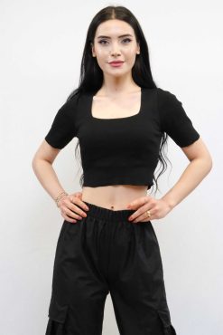 Moda Çizgi Kare Yaka Triko Crop Siyah