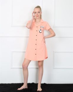 Moda Çizgi Kadın Penye Önden Düğmeli Pembe Tunik Gecelik 1032