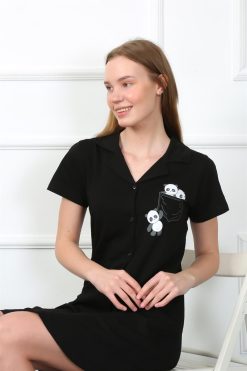 Moda Çizgi Kadın Penye Önden Düğmeli Siyah Tunik Gecelik 1032