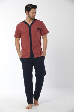 Moda Çizgi Erkek Kiremit Renk Önden Düğmeli Pijama Takım 6537
