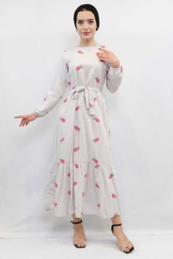 Moda Çizgi Çiçek Desenli Pileli Elbise Fuşya