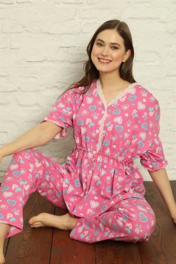 Moda Çizgi Kadın Büyük Beden Önden Düğmeli Fuşya Pijama Takım 202185