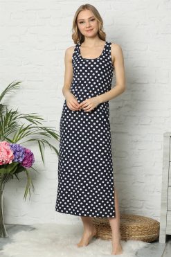 Moda Çizgi Kalın Askılı Lacivert Beyaz Penye Uzun Gecelik 926