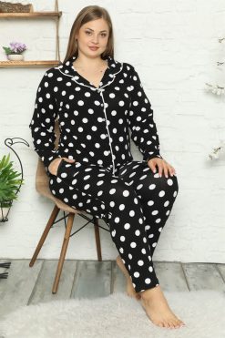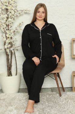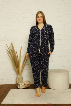 Moda Çizgi Kadın Pamuklu Cepli Uzun Kol Büyük Beden Pijama Takım 202057