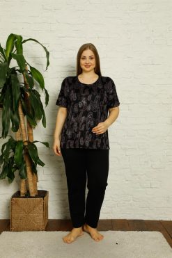 Moda Çizgi Kadın %100 Pamuk Cepli Kısa Kol Büyük Beden Pijama Takım