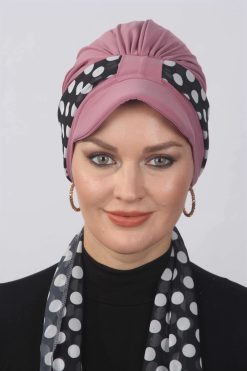 Puantiyeli Fularlı Şapka Bone Gül Kurusu