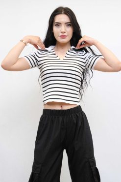 Gömlek Yaka Çizgili Triko Bluz Beyaz