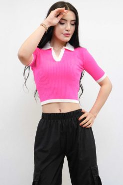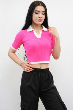 Moda Çizgi Renkli Yaka Triko Crop Pembe