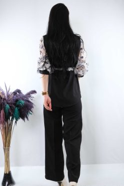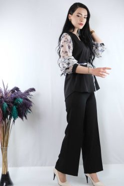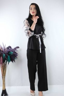 Ürün gövde kısım düz siyah kol kısımları desenli şifon kumaştır