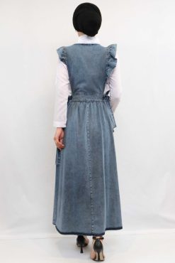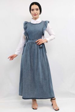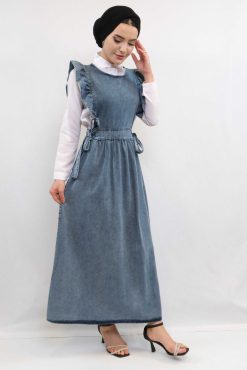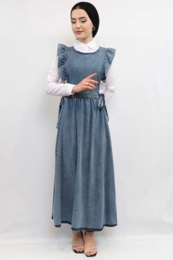 Moda Çizgi Fırfırlı Salopet Kot Elbise Koyu Mavi