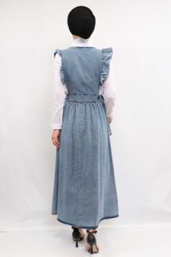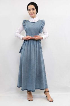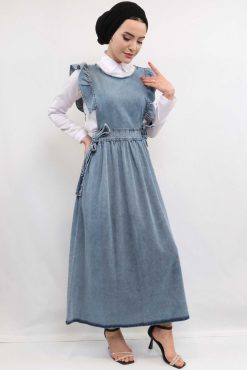 Moda Çizgi Fırfırlı Salopet Kot Elbise Mavi