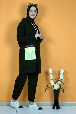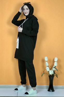 Yeni sezon tesettür moda ürünüdür.Ürünümüz iki iplik kumaştan üretilmiştir. Uzun kolludur . Ürünümüz de tek cep bulunmaktadır. .Eşofman altı paçası lastiklidir. 4 Mevsim kullanıma uygundur.