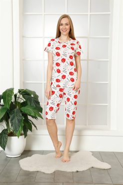 Moda Çizgi Kadın %100 Pamuk Penye Kısa Kol Kapri Pijama Takım