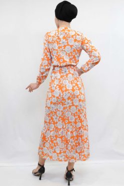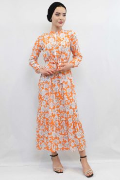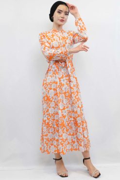 Moda Çizgi Çiçek Desenli Pileli Elbise Turuncu