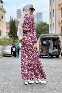 Kemerli Desenli Tesettür Elbise Gül Kurusu